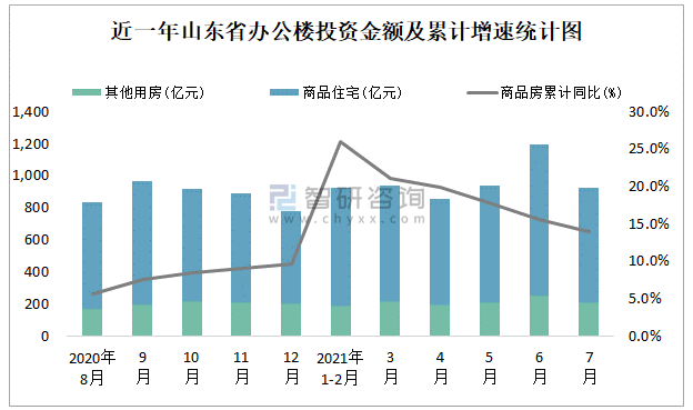 根據(jù)國(guó)家統(tǒng)計(jì)局?jǐn)?shù)據(jù)統(tǒng)計(jì)可知:2021年7月山東省房地產(chǎn)開發(fā)投資商品房投資金額為924.31億元,其中包括辦公樓、商業(yè)營(yíng)業(yè)用房等其他用房211.86億元(注:辦公樓、商業(yè)營(yíng)業(yè)用房未分開統(tǒng)計(jì));2021年1-7月山東省房地產(chǎn)開發(fā)投資包括辦公樓在內(nèi)的其他用房累計(jì)金額為1283.69億元。