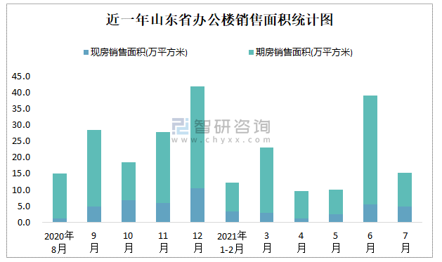 根據(jù)國(guó)家統(tǒng)計(jì)局?jǐn)?shù)據(jù)可知:2021年7月山東省辦公樓銷售面積為15.3萬(wàn)平方米(其中銷售現(xiàn)房4.87萬(wàn)平方米,期房10.43萬(wàn)平方米);2021年1-7月山東省辦公樓累計(jì)銷售面積為109.5萬(wàn)平方米;近一年山東省辦公樓期房銷售面積遠(yuǎn)高于現(xiàn)房銷售面積,2021年7月四川、廣東、江蘇的辦公樓銷售面積最多,江蘇、上海、浙江、廣東的辦公樓現(xiàn)房銷售面積高于其他各省市。
