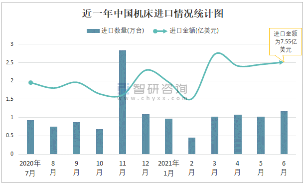 根據中國海關數據顯示:2021年6月中國機床進口數量為1.17萬臺,同比增長31%,進口金額為7.55億美元,同比增長10.6%,2021年6月中國機床出口數量為265.21萬臺,同比增長33.4%,出口金額為7.5億美元,同比增長41.8%;2021年1-6月中國機床進口數量為5.73萬臺,進口金額為40.76億美元,出口數量為1329.91萬臺,出口金額為40.13億美元。