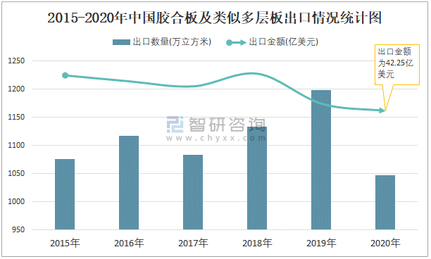 2015-2020年中國膠合板及類似多層板出口情況統計圖