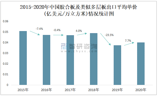 2015-2020年中國膠合板及類似多層板出口平均單價(億美元/萬臺)情況統計圖
