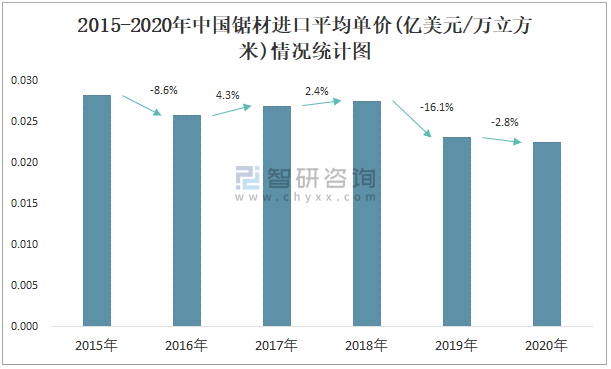 2015-2020年中國鋸材進口平均單價(億美元/萬臺)情況統計圖