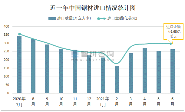 根據中國海關數據顯示:2021年6月中國鋸材進口數量為263萬立方米,同比下降25%,進口金額為6.68億美元,同比下降15.9%,2021年1-6月中國鋸材進口數量為1406萬立方米,進口金額為35.73億美元。