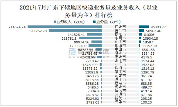 2021年7月廣東下轄地區快遞業務量及業務收入(以業務量為主)排行榜