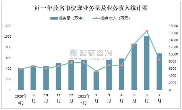 近一年茂名市快遞業務量及業務收入統計圖