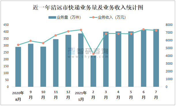 近一年清遠市快遞業(yè)務(wù)量及業(yè)務(wù)收入統(tǒng)計圖