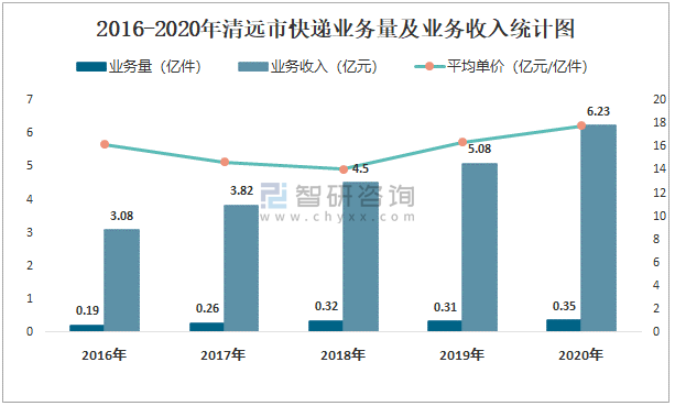 2016-2020年清遠市快遞業(yè)務(wù)量及業(yè)務(wù)收入統(tǒng)計圖