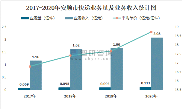 2017-2020年安順市快遞業務量及業務收入統計圖