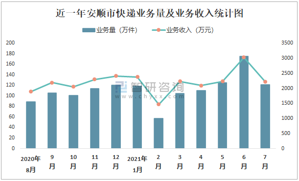 2021年7月安順市快遞業務量與業務收入分別為121.12萬件和2224.94萬元