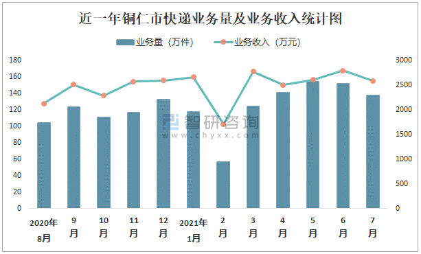 近一年銅仁市快遞業務量及業務收入統計圖