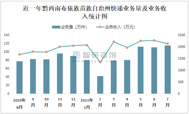 近一年黔西南布依族苗族自治州快遞業務量及業務收入統計圖