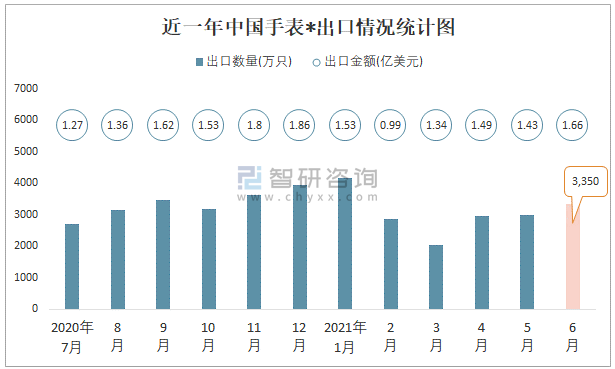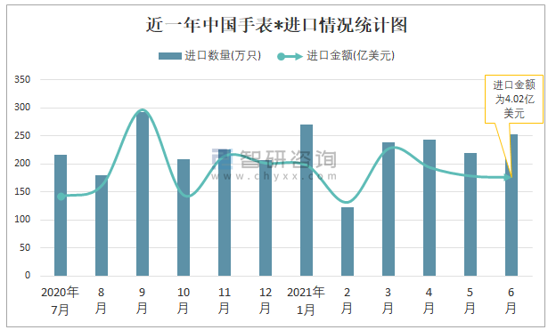 根據中國海關數據顯示:2021年6月中國手表進口數量為252萬只,同比增長150.5%,進口金額為4.02億美元,同比增長81.2%,2021年6月中國手表出口數量為3350萬只,同比增長57.7%,出口金額為1.66億美元,同比增長76.1%;2021年1-6月中國手表進口數量為1350萬只,進口金額為25.26億美元,出口數量為18343萬只,出口金額為8.43億美元。
