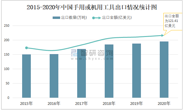 2015-2020年中國手用或機用工具出口情況統計圖