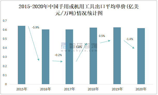 2015-2020年中國手用或機用工具出口平均單價(億美元/萬臺)情況統計圖