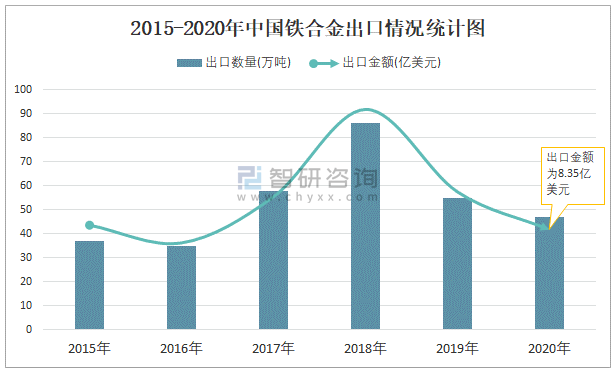 2015-2020年中國鐵合金出口情況統計圖