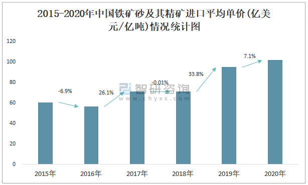 根據中國海關數據顯示:2015-2020年中國鐵礦砂及其精礦進口數量與進口金額總體呈上升趨勢;2015-2020年中國鐵礦砂及其精礦進口平均單價2019年增長速度最快,而2016年中國鐵礦砂及其精礦進口平均單價下降速度最快,下滑了6.9%。