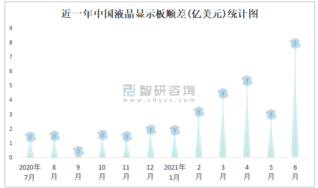 近一年中國液晶顯示板順差(億美元)統(tǒng)計(jì)圖