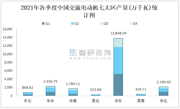 2021年各季度中國交流電動機七大區產量統計圖