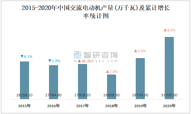 2015-2020年中國交流電動機產量及增長率統計圖