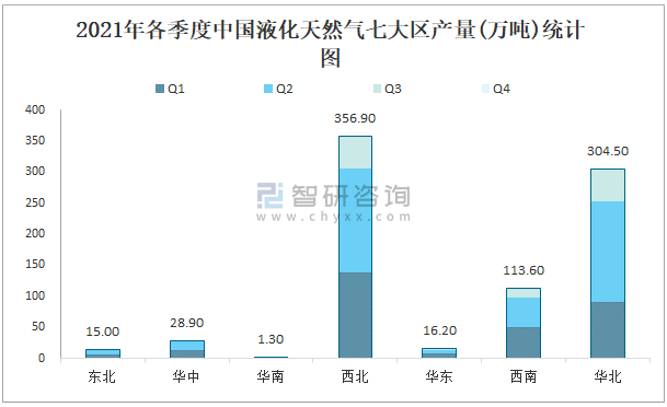 2021年各季度中國液化天然氣七大區產量統計圖