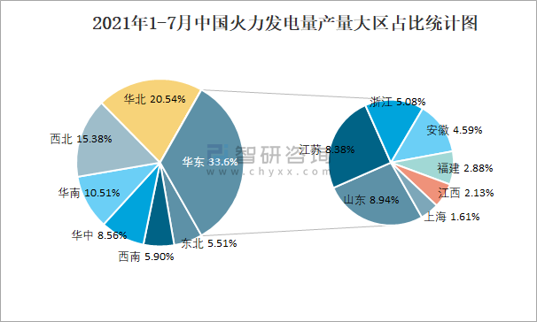 2021年1-7月中國火力發電量產量大區占比統計圖