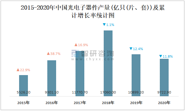 2015-2020年中國光電子器件產量及增長率統計圖