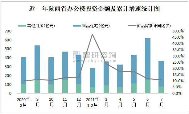 根據國家統計局數據統計可知:2021年7月陜西省房地產開發投資商品房投資金額為364.2億元,其中包括辦公樓、商業營業用房等其他用房76.64億元(注:辦公樓、商業營業用房未分開統計);2021年1-7月陜西省房地產開發投資包括辦公樓在內的其他用房累計金額為581.09億元。