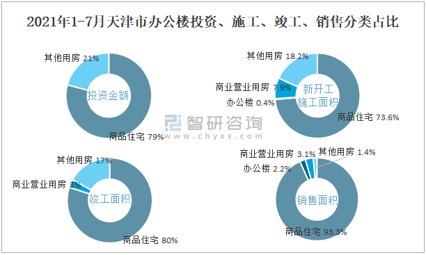 根據(jù)國(guó)家統(tǒng)計(jì)局?jǐn)?shù)據(jù)統(tǒng)計(jì)可知:2021年1-7月天津市房地產(chǎn)開發(fā)企業(yè)在包括辦公樓在內(nèi)的其他用房投資金額占比為20.9%(注:只有投資金額中其他用房包含辦公樓、商業(yè)營(yíng)業(yè)用房),辦公樓的新開工面積與竣工面積所占比重差異不大,從銷售面積來(lái)看,辦公樓銷售面積占比少于商業(yè)營(yíng)業(yè)用房銷售面積占比。