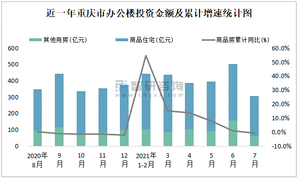 根據國家統計局數據統計可知:2021年7月重慶市房地產開發投資商品房投資金額為307.48億元,其中包括辦公樓、商業營業用房等其他用房62.07億元(注:辦公樓、商業營業用房未分開統計);2021年1-7月重慶市房地產開發投資包括辦公樓在內的其他用房累計金額為611.51億元。