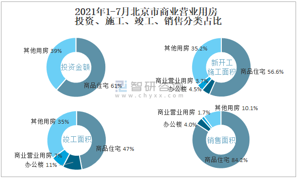 根據(jù)國家統(tǒng)計局?jǐn)?shù)據(jù)統(tǒng)計可知:2021年1-7月北京市房地產(chǎn)開發(fā)企業(yè)在包括商業(yè)營業(yè)用房在內(nèi)的其他用房投資金額占比為38.7%(注:只有投資金額中其他用房包含辦公樓、商業(yè)營業(yè)用房),商業(yè)營業(yè)用房的新開工面積與竣工面積所占比重差異不大,從銷售面積來看,商業(yè)營業(yè)用房銷售面積占比少于辦公樓銷售面積占比。