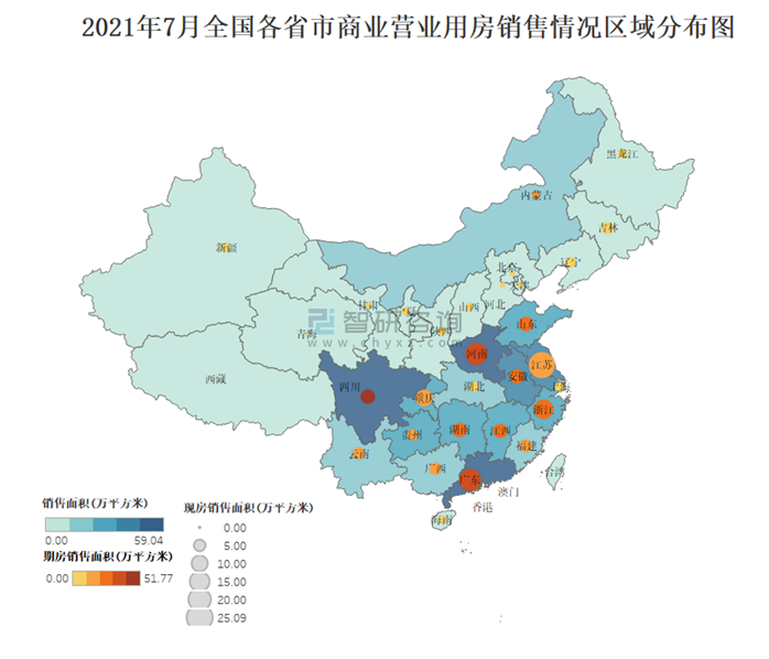 2021年7月全國各省市商業(yè)營業(yè)用房銷售情況區(qū)域分布圖
