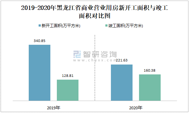 2019-2020年黑龍江省商業營業用房新開工面積與竣工面積對比圖
