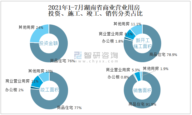 根據國家統計局數據統計可知:2021年1-7月湖南省房地產開發企業在包括商業營業用房在內的其他用房投資金額占比為24.1%(注:只有投資金額中其他用房包含辦公樓、商業營業用房),商業營業用房的新開工面積與竣工面積所占比重差異不大,從銷售面積來看,商業營業用房銷售面積占比高于辦公樓銷售面積占比。