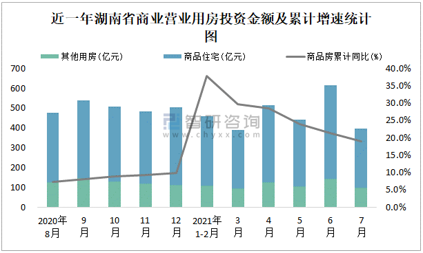 根據國家統計局數據統計可知:2021年7月湖南省房地產開發投資商品房投資金額為397.95億元,其中包括辦公樓、商業營業用房等其他用房97.23億元(注:辦公樓、商業營業用房未分開統計);2021年1-7月湖南省房地產開發投資包括商業營業用房在內的其他用房累計金額為679.57億元。