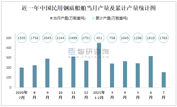 根據國家統計局數據顯示:2021年7月中國民用鋼質船舶產量為156萬載重噸,同比下降22.8%;2021年1-7月中國民用鋼質船舶累計產量為1762.9萬載重噸,累計增長13.8%;2015-2020年中國民用鋼質船舶產量2015年達到最高,此后總體呈現下降趨勢。