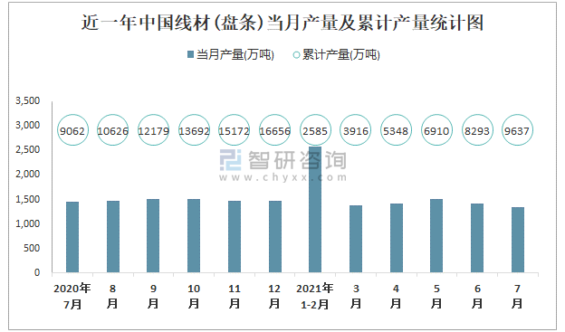 2021年1-7月中國線材(盤條)產量為9637.2萬噸 累計增長4.7%