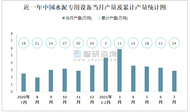 根據(jù)國(guó)家統(tǒng)計(jì)局?jǐn)?shù)據(jù)顯示:2021年7月中國(guó)水泥專(zhuān)用設(shè)備產(chǎn)量為2.9萬(wàn)噸,同比增長(zhǎng)12.3%;2021年1-7月中國(guó)水泥專(zhuān)用設(shè)備累計(jì)產(chǎn)量為24.2萬(wàn)噸,累計(jì)增長(zhǎng)28.1%;2015-2020年中國(guó)水泥專(zhuān)用設(shè)備產(chǎn)量2017年達(dá)到最高,此后逐年遞減。