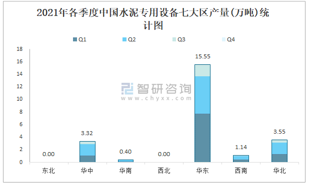 2021年各季度中國(guó)水泥專(zhuān)用設(shè)備七大區(qū)產(chǎn)量統(tǒng)計(jì)圖
