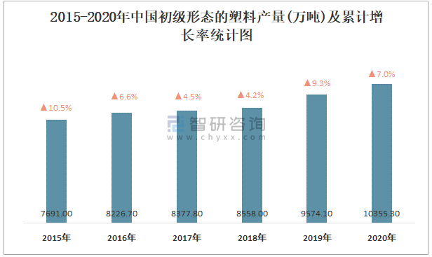 2015-2020年中國初級形態的塑料產量及增長率統計圖