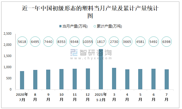 根據國家統計局數據顯示:2021年7月中國初級形態的塑料產量為901萬噸,同比增長5.3%;2021年1-7月中國初級形態的塑料累計產量為6397.8萬噸,累計增長11.2%;2015-2020年中國初級形態的塑料產量逐年遞增,2020年達到最高。
