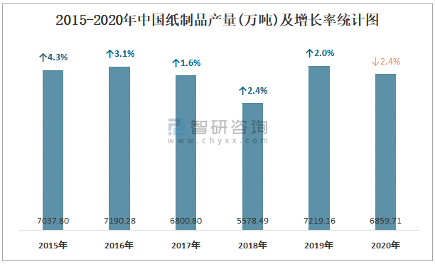 2015-2020年中國(guó)紙制品產(chǎn)量及增長(zhǎng)率統(tǒng)計(jì)圖