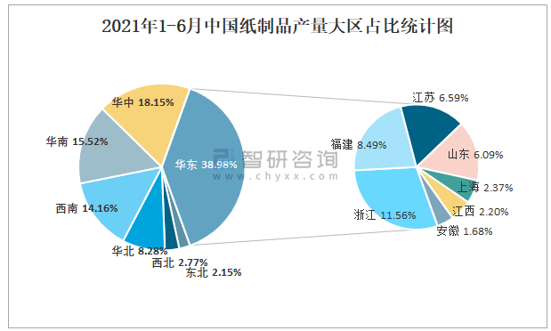 2021年1-6月中國(guó)紙制品產(chǎn)量大區(qū)占比統(tǒng)計(jì)圖