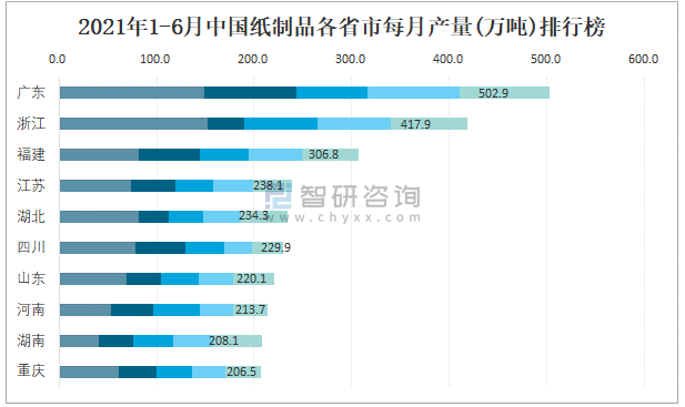 2021年1-6月中國(guó)紙制品各省市每月產(chǎn)量排行榜
