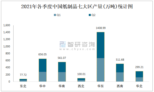 2021年各季度中國(guó)紙制品七大區(qū)產(chǎn)量統(tǒng)計(jì)圖
