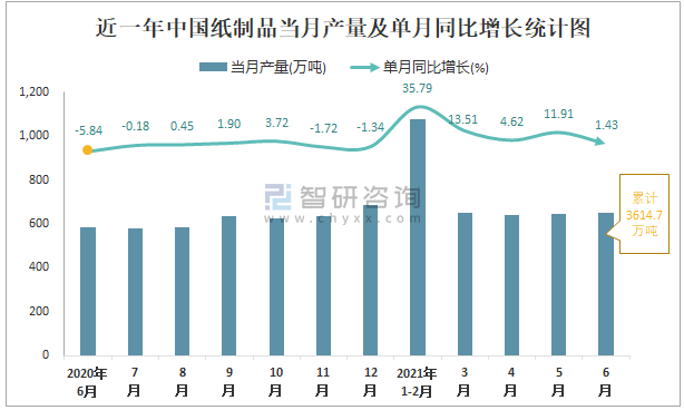 根據(jù)國(guó)家統(tǒng)計(jì)局?jǐn)?shù)據(jù)顯示:2021年6月中國(guó)紙制品產(chǎn)量為650萬(wàn)噸,同比增長(zhǎng)1.43%;2021年1-6月中國(guó)紙制品累計(jì)產(chǎn)量為3614.7萬(wàn)噸,同比增長(zhǎng)15.95%;2015-2020年中國(guó)紙制品產(chǎn)量2019年達(dá)到最高,次年有所下滑。