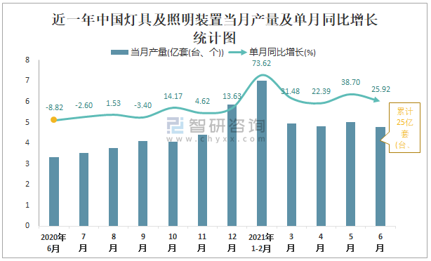 根據國家統計局數據顯示:2021年6月中國燈具及照明裝置產量為4.8億套(臺、個),同比增長25.92%;2021年1-6月中國燈具及照明裝置累計產量為25億套(臺、個),同比增長37.3%;2015-2020年中國燈具及照明裝置產量2019年達到最高,次年出現小幅度下滑。
