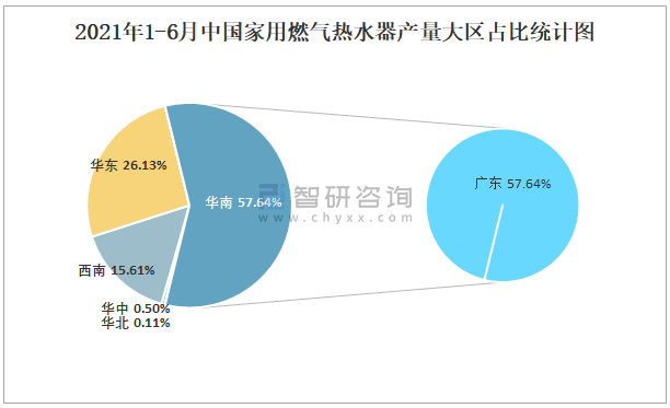 2021年1-6月中國家用燃氣熱水器產量大區占比統計圖