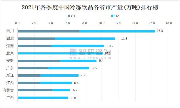 根據國家統計局數據顯示:2021年各季度中國冷凍飲品主要集中在華東、華中、華北地區生產;2021年1-6月中國冷凍飲品產量大區分布相對均衡,其中華東地區產量最高,特別是安徽省貢獻了最多產量;2021年各季度中國冷凍飲品各省產量呈現梯隊式分布,四川、湖北、河南等省產量排名前三。
