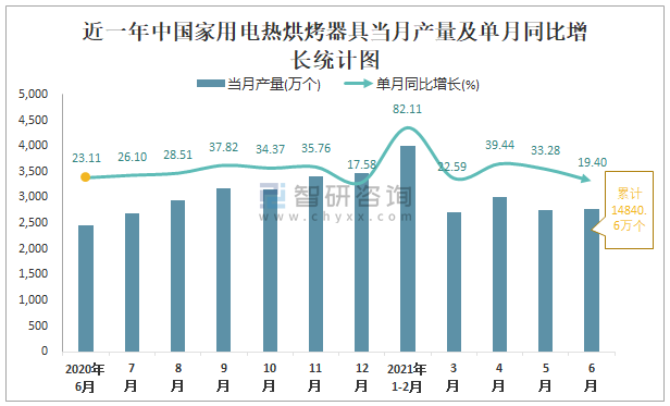 根據國家統計局數據顯示:2021年6月中國家用電熱烘烤器具產量為2776萬個,同比增長19.4%;2021年1-6月中國家用電熱烘烤器具累計產量為14840.6萬個,同比增長42.95%;2015-2020年中國家用電熱烘烤器具產量2016年跌至最低,此后逐年遞增。