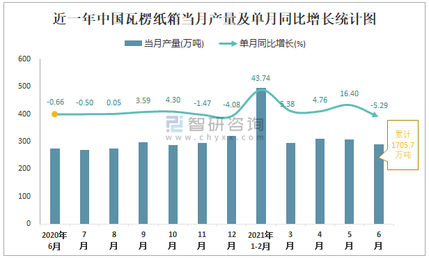 根據國家統計局數據顯示:2021年6月中國瓦楞紙箱產量為290萬噸,同比下降5.29%;2021年1-6月中國瓦楞紙箱累計產量為1705.7萬噸,同比增長14.61%;2015-2020年中國瓦楞紙箱產量2018年跌至最低,次年有所回升。